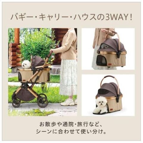 ◆バギー・キャリー・ハウスの3WAY:便利な3パターンの使い方ができるので、お散歩や通院・旅行など、シーンに合わせて使い分け。