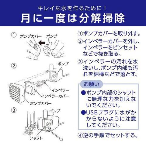 ※水が循環しなくなるおそれがありますので、約1ヶ月に1度は分解してポンプ内部を掃除してください。