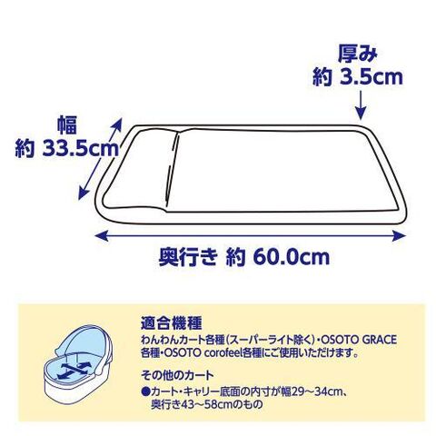 ■対応商品:わんわんカート各種(スーパーライト除く)、OSOTOGRACE各種、OSOTOcorofeel各種、カート、キャリー底面の内寸が幅29~34cm、奥行43~58cmのもの