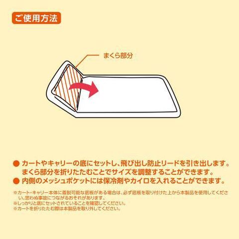 (1)カートやキャリーの底にセットし、飛び出し防止リードを引き出します。まくら部分を折りたたむことでサイズを調整することができます。
