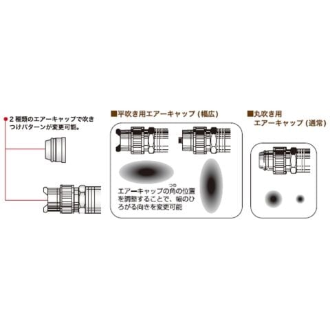 付属する2種類の先端ノズルキャップを付け替えることで、通常と幅広の吹き付けパターンを切り替えることで用途が広がります。