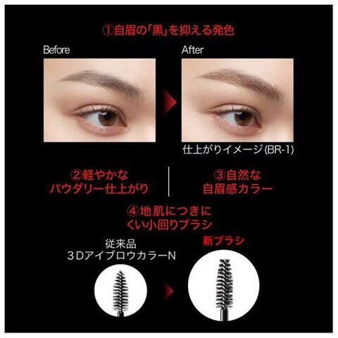 ※眉マスカラ。自眉の黒さを抑えて、高発色な色づきを実現。ぱりぱりしにくく、軽やかなパウダリー仕上がり。