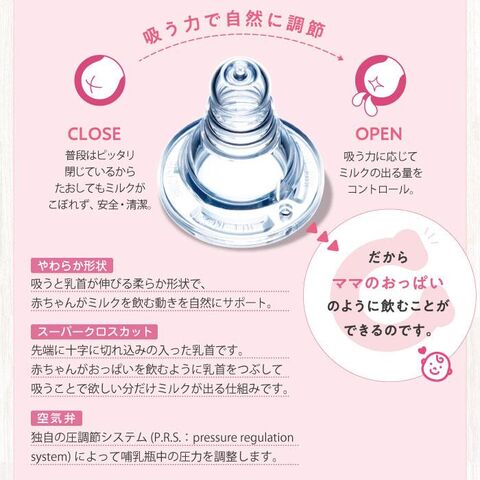 ◆赤ちゃんが吸う力に応じてミルクが出る量をコントロールするスーパークロスカットだから、ChuChuの乳首はサイズアップ不要!