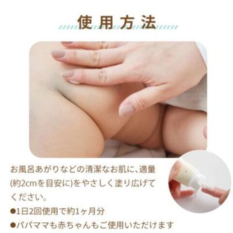 ◆使用方法:お風呂あがりなどの清潔なお肌に、適量(2cmを目安に)をやさしく塗り広げてください。