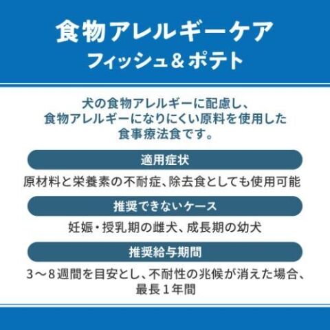 ◆「VetsWell 食物アレルギーケア フィッシュ&ポテト」は犬の食物アレルギーに配慮し、特別に調製された食事療法食です。