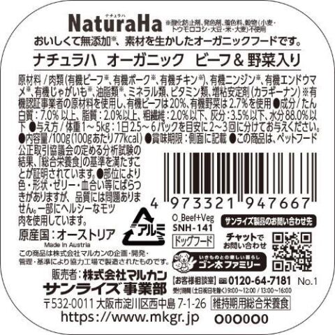 マルカンサンライズ事業部 ナチュラハ オーガニック ビーフ&野菜入り 100g SNH-141Nビ-フ&ヤサイ100G 【返品種別B】
