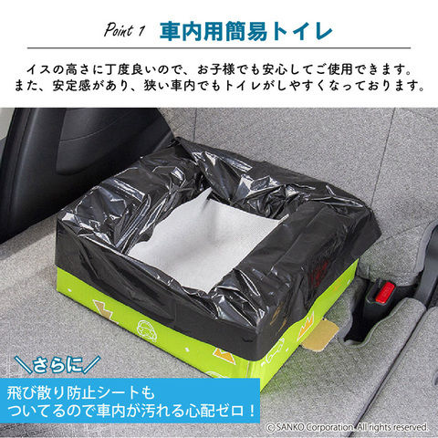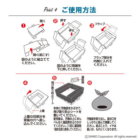 - 5点セット(トイレ本体×1個、凝固剤×5個、汚物袋×5枚、飛び散り防止シート×5枚、簡易ポンチョ×1枚)