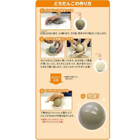 ◆昔から遊ばれていたどろだんご作り。最近は砂場などの土の衛生面の不安や、日が経つと割れてしまうことから、あまり遊ばれなくなりました。「コロピカどろだんご 制作キット」は、自然の砂と粘土を材料に、コロコロと転がすほどピカピカに輝くだんごを作ることができます。