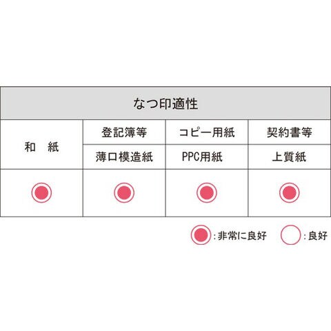 ◆盤面にはシルケット加工を施したきめ細かい表布を、朱油には顔料分散技術により、顔料粒子径を最適な大きさに調整した顔料系朱油を採用しています。にじみの少ない鮮明な印影は、転写しにくく、耐久性にも優れているので長期保存書類へのなつ印にも安心です。