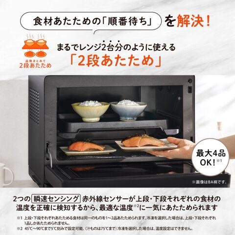 2つの瞬速センシング赤外線センサーが、上段・下段に置いた食材の温度を1秒ごとに正確に検知するので、それぞれに設定した温度※4 にあたためられ、便利です※5。