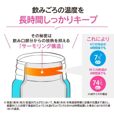 ※1 保温(保冷)効力:室温20℃±2℃において、熱湯(冷水)を取扱説明書に記載の位置まで満たし、縦置きにした状態で湯温95℃±1℃(水温4℃±1℃)のときから6時間放置した場合におけるその湯(水)の温度。