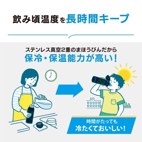 ・ステンレス真空2重のまほうびんだから保温・保冷力が高く、飲み物の温度を長時間キープ!