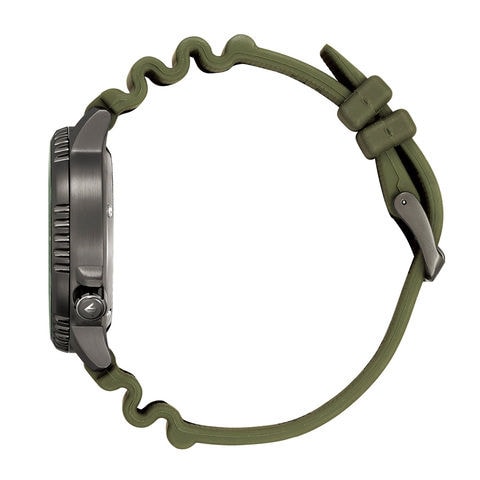 深いカーキ色の文字板とグリーンのアルミリングも相まって、ひときわ力強い印象を与えます。