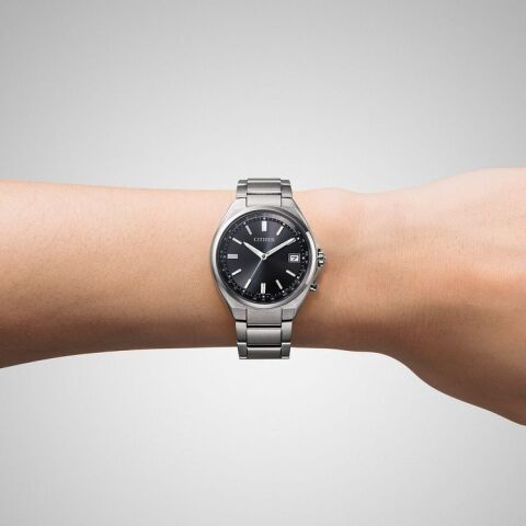 ・ケースとバンドにスーパーチタニウムTMを採用した、ベーシックな3針タイプのエコ・ドライブ電波時計。手首が細めの方にもフィットしやすい37.5mmケースです。