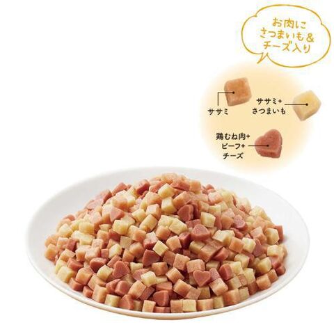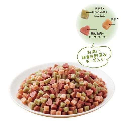 肉類(鶏肉、鶏ささみ、鶏むね肉、牛肉)、穀類(小麦粉、グルテン)、脱脂大豆、でん粉類、糖類(オリゴ糖を含む)、チーズ、油脂類、ゼラチン、野菜類(ほうれん草、サツマイモ、ニンジン)、食物繊維(ポリデキストロース)、軟骨抽出物(コンドロイチン含有)、乳酸菌、CoQ10、グリセリン、ミネラル類(カルシウム、リン、カリウム、ナトリウム、塩素、マグネシウム、鉄、銅、マンガン、亜鉛、ヨウ素、セレン)、pH調整剤、ビタミン類(A、B1、B2、B6、B12、C、D、E、パントテン酸、ナイアシン、葉酸、コリン)、ソルビトール、着色料(コチニール、クチナシ、ベニバナ)、増粘多糖類、膨張剤、リン酸塩(Na)、グルコサミン
