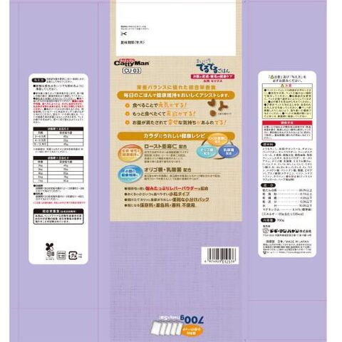 とうもろこし、肉類(チキンミール、チキンレバーパウダー、ビーフパウダー)、コーングルテンミール、小麦粉、脱脂大豆、動物油脂、魚粉、フィッシュエキス、おからパウダー、ローストアマニ、オリゴ糖、乳酸菌、ミネラル類(Na、Cl、Ca、P、K、Zn、Fe、Mn、Cu、Co、I)、ビタミン類(A、B1、B2、B6、B12、C、D3、E、K3、コリン、ニコチン酸、パントテン酸、葉酸、ビオチン)、アミノ酸類(メチオニン、リジン、トリプトファン、タウリン)、酸化防止剤(ミックストコフェロール、ハーブ抽出物)