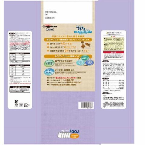 とうもろこし、肉類(チキンミール、チキンレバーパウダー)、コーングルテンミール、小麦粉、動物油脂、魚粉、フィッシュエキス、おからパウダー、カツオパウダー、まぐろパウダー、オリゴ糖、乳酸菌、ミネラル類(Na、Cl、Ca、P、K、Zn、Fe、Mn、Cu、Co、I)、ビタミン類(A、B1、B2、B6、B12、C、D3、E、K3、コリン、ニコチン酸、パントテン酸、葉酸、ビオチン)、アミノ酸類(メチオニン、リジン、トリプトファン、タウリン)、酸化防止剤(ミックストコフェロール、ハーブ抽出物)