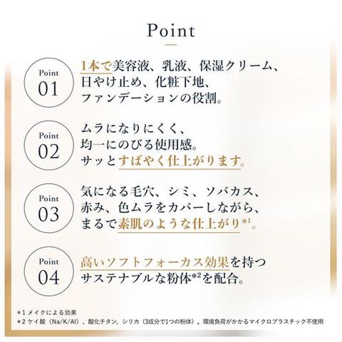 ◆1本で美容液、乳液、保湿クリーム、日やけ止め、化粧下地、ファンデーションの役割。