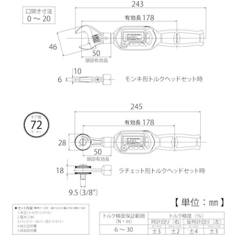 - トルク精度:モンキ形(時計回り(右)±3%、反時計回り(左)±4%)、ラチェット形(時計回り(右)±2%、反時計回り(左)±3%)