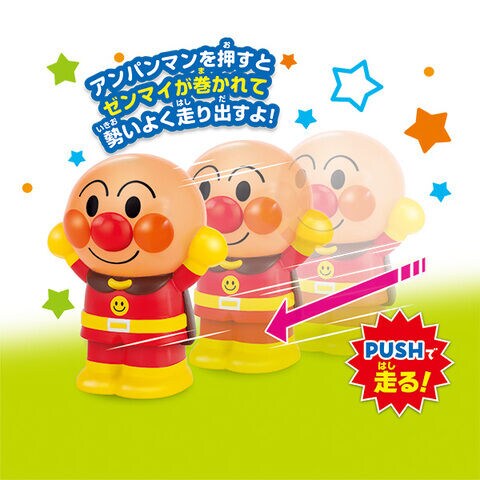 アンパンマンの頭をポンと押すと、ゼンマイが巻かれて勢いよく走り出すよ!