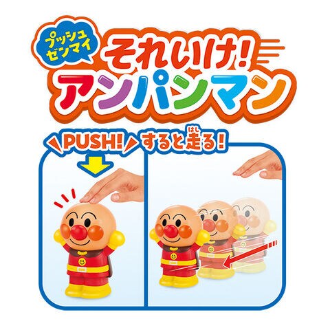 別売りのプッシュゼンマイシリーズ「それいけ! アンパンマンごう」、「それいけ! SLマン」、「アンパンマン列車」、「ようちえんアンパンマンバス」の4種類を集めて遊んでも楽しい♪