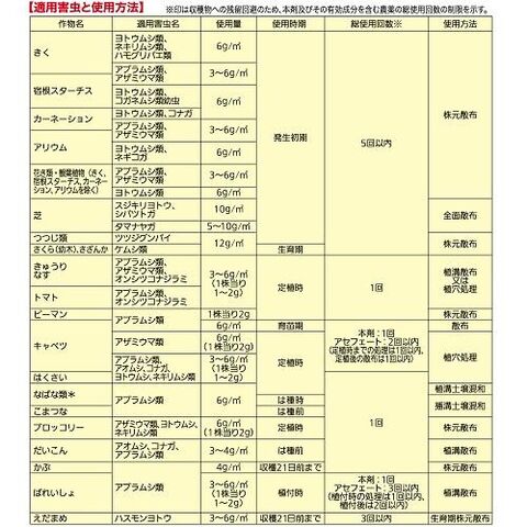 ※みずかけな(水掛菜)、カラー及び花はすに使用する場合は、ほ場内に水がない状態で使用してください。また、使用後14日間は入水しないでください。