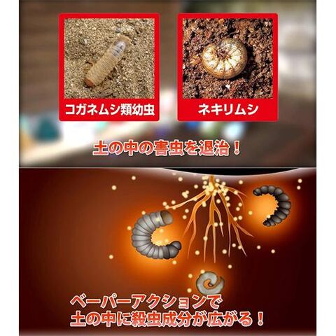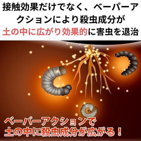 ◆接触効果だけでなく、ベーパーアクションにより殺虫成分が土の中に広がって効果的に害虫を退治します。