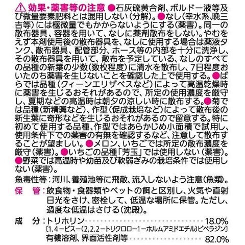 ◆乳剤のため計量しやすく、また散布後の葉の汚れも少なく花(ばら、きく)の観賞価値をそこないません。