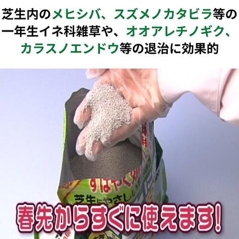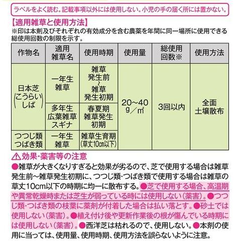 芝生内のメヒシバ、スズメノカタビラ等の一年生イネ科雑草や、オオアレチノギク、カラスノエンドウ等の退治に効果的です。