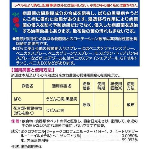 ◆病原菌の細胞膜成分の合成を阻害し、ばらの黒星病やうどんこ病に優れた効果があります。