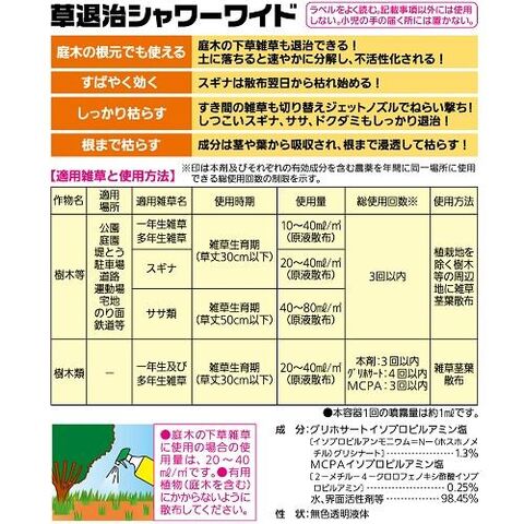 - 有効成分:グリホサートイソプロピルアミン塩 1.3%、MCPAイソプロピルアミン塩 0.25%
