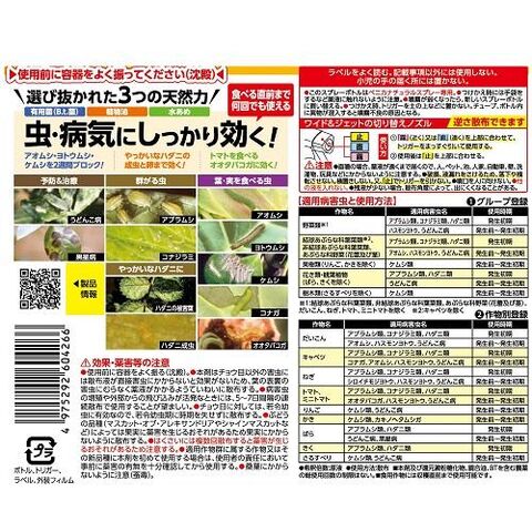 ■有効成分:還元澱粉糖化物 0.6%、調合油 0.32%、バチルス チューリンゲンシス菌の生芽胞及び産生結晶毒素10%
