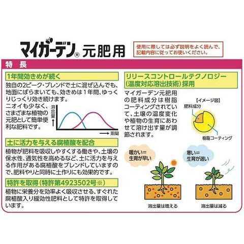 マイガーデン元肥用の肥料成分は樹脂コーティングされていて、土壌の温度変化や植物の生育にあわせて溶け出す量が調節されます。