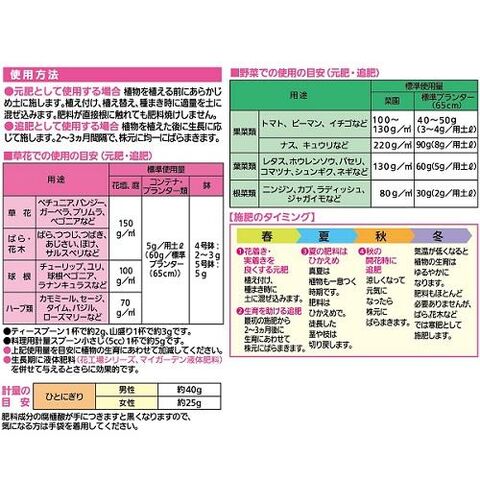 植え付け、植え替え、種まき時に適量を土に混ぜ込みます。