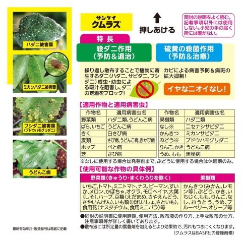 ◆殺ダニ作用(予防&退治)繰り返し散布することで植物に寄生するダニ(ハダニ、サビダニ、フシダニ)成虫・幼虫による吸汁を阻害し、ダニの定着をブロック!