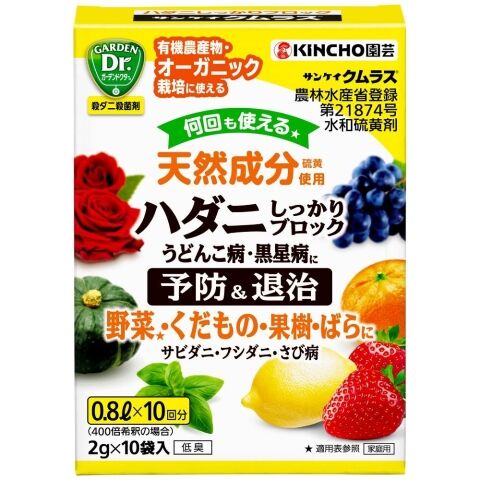 ◆硫黄の殺菌作用でカビによる病害(うどんこ病、黒星病、さび病、赤かび病、白さび病、べと病)を予防。