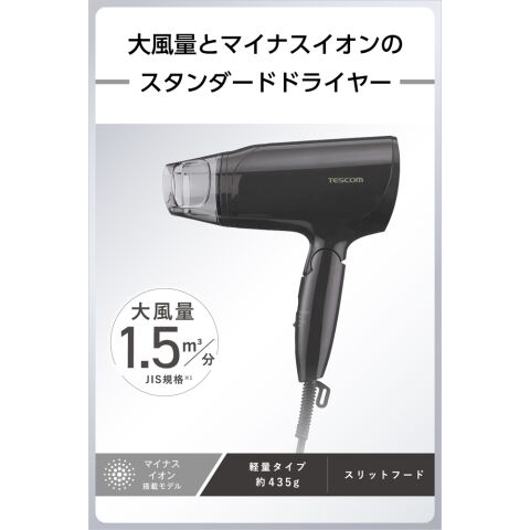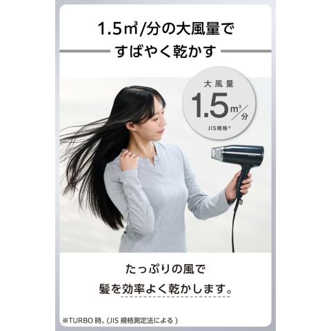 1分間に1.5m3とたっぷりの風で髪を効率よく乾かします。
