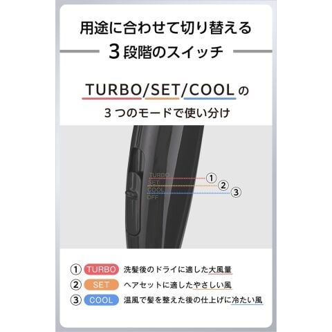 洗髪後のドライに適した大風量の「TURBO」、優しい風で髪のセットに適した「SET」、