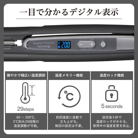 髪質やダメージ状態に合わせて、60~200℃(5℃刻み29段階)の細かな温度調整が可能。