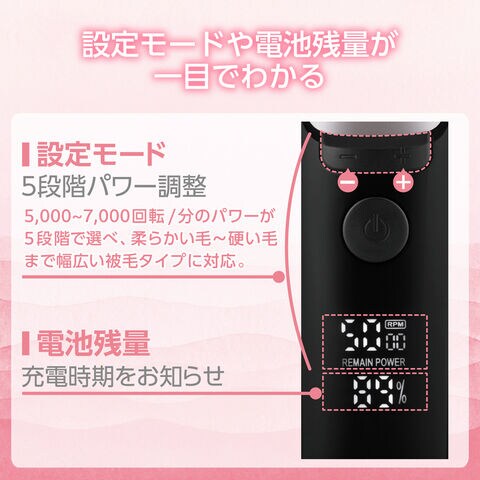 5000~7000回転/分のパワーを5段階で設定でき、毛の硬さや量、振動音などに合わせて調節できます。