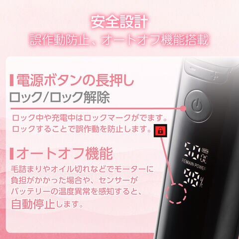 モーターとバッテリーを守るオートオフ機能を搭載。毛詰まりやオイル切れなどでモーターに負荷がかかった場合や、