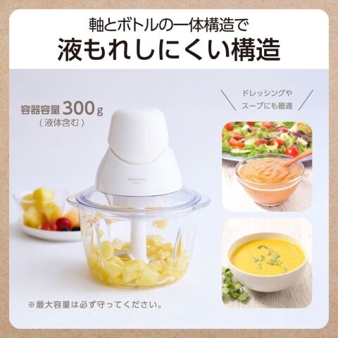 ◆液もれしにくい構造軸とボトルの一体構造で液もれしにくいので、ドレッシングやスープが作れます。