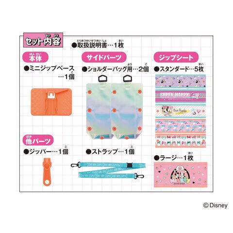 (スタンダード×5枚、ラージ×1枚、ショルダーバッグ用×2個) ミニジップベース×1個 ショルダーストラップ×1個 ジッパー×1個 取扱説明書×1枚