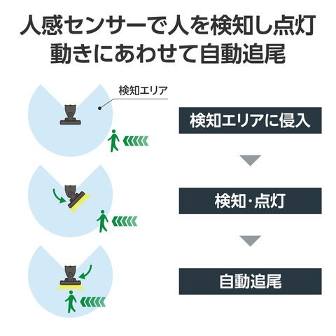 人感センサーで人を検知し、点灯および180°自動追尾します。