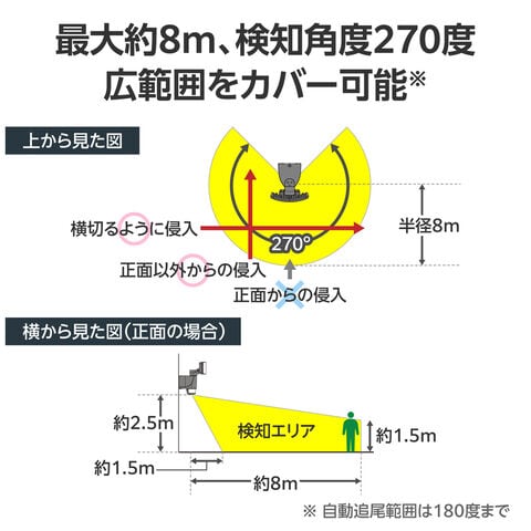 - センサー検知範囲:水平270°・距離8mまで(高さ2.5mに設置時目安)