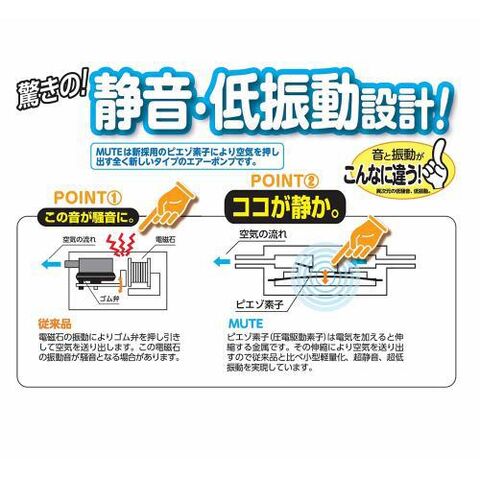 ◆電磁石の振動で空気を押し出す従来のエアーポンプと異なり、ピエゾ素子(圧電駆動素子)自身が伸縮し空気を押し出すため小型軽量化、超静音、超低振動を実現しました。
