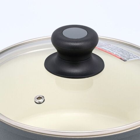 - 材質:本体/アルミニウム合金(縁巻き加工)、内面/セラミック塗膜加工(ダイキン)、外面/焼付け塗装(アイスフラワー柄)、ハンドル/アップハンドルフェノール樹脂(ジョイント塗り)、蓋/全面物理強化ガラス