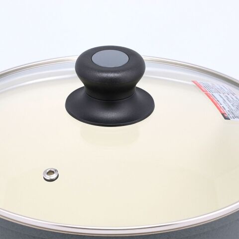 • 材質:本体/アルミニウム合金(縁巻き加工)、内面/セラミック塗膜加工(ダイキン)、外面/焼付け塗装(アイスフラワー柄)、ハンドル/アップハンドルフェノール樹脂(ジョイント塗り)、蓋/全面物理強化ガラス
