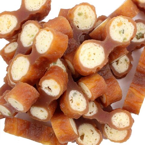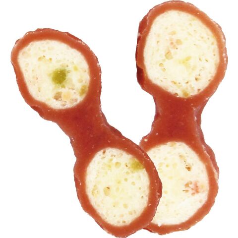 ■原材料:肉類(鶏肉、ササミ、牛皮)、小麦粉、でん粉類、にんじん、ほうれん草、クロレラ、軟骨抽出物(コンドロイチン含有)、グリセリン、ソルビトール、ミネラル類(カルシウム)、膨張剤、リン酸塩(Na)、着色料(β-カロテン、紅麹)、グルコサミン
