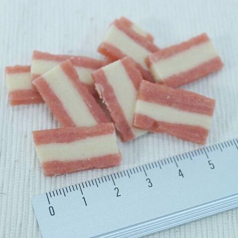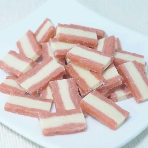 ■原材料:小麦粉、肉類(鶏ササミ、牛肉、鶏肉)、チーズ、小麦たん白、脱脂大豆、糖類、植物油脂、乳酸菌、グリセリン、ソルビトール、保存料(ソルビン酸カリウム、デヒドロ酢酸ナトリウム)、酸味料、ミネラル類(ナトリウム)、着色料(酸化チタン、黄4、赤106)、乳化剤、酸化防止剤(エリソルビン酸ナトリウム)、香料
